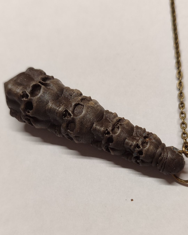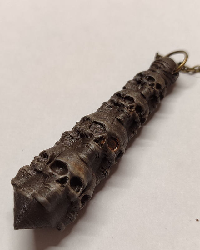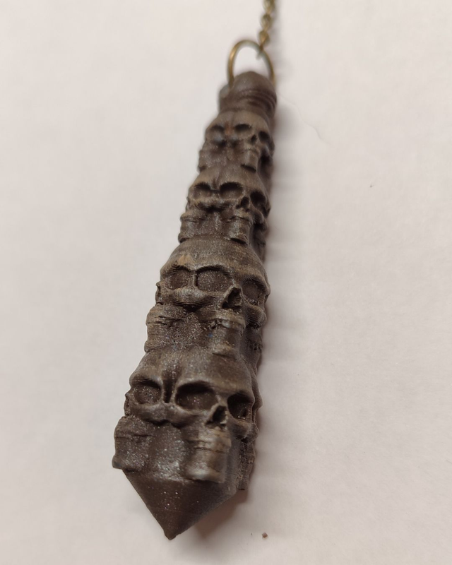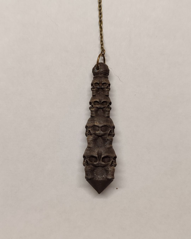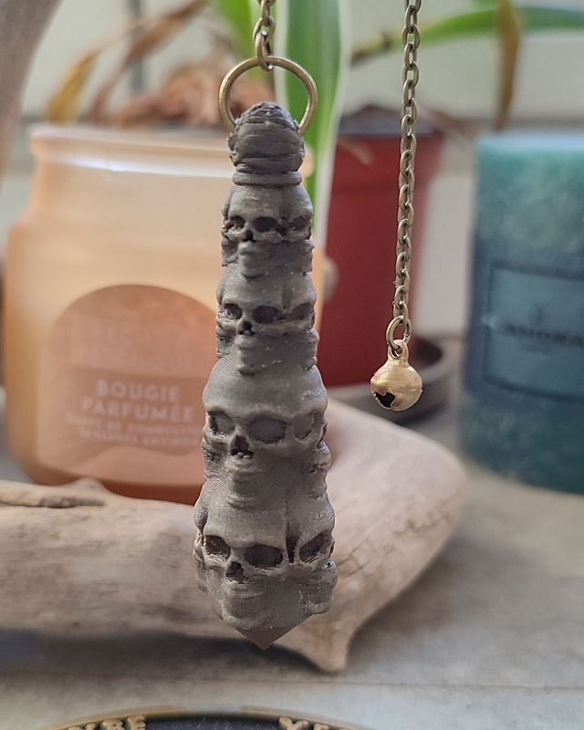 Pendule de radiesthésie composé d'une colonne de quatre crânes superposés. Conçu pour la pratique de la divination, du magnétisme et des soins énergétiques, ce pendule allie la précision de l'impression 3D à une finition artisanale soignée.