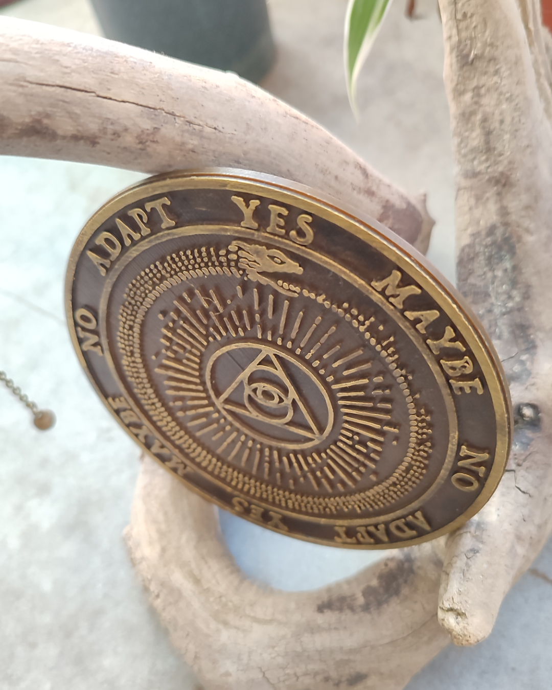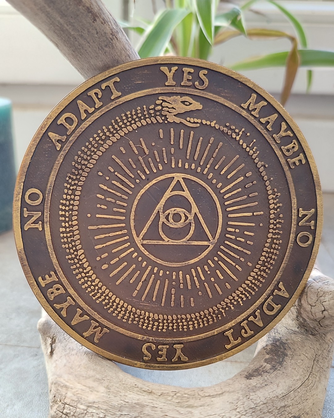 Le cercle extérieur indique : Yes / No / Maybe / Adapt. Le motif central associe un œil stylisé dans un triangle rayonnant, entouré d’un ouroboros (serpent circulaire), symbole de cycle et de transformation.