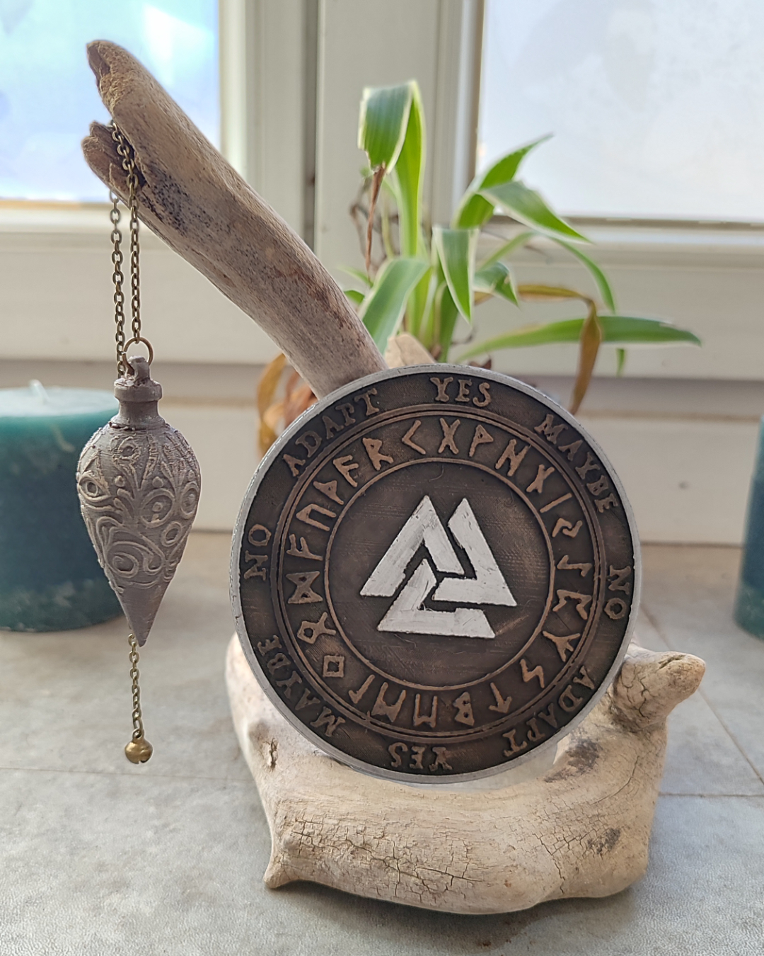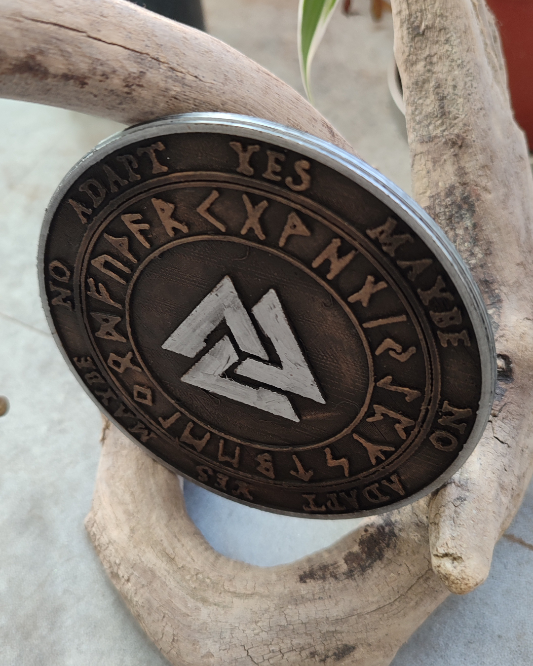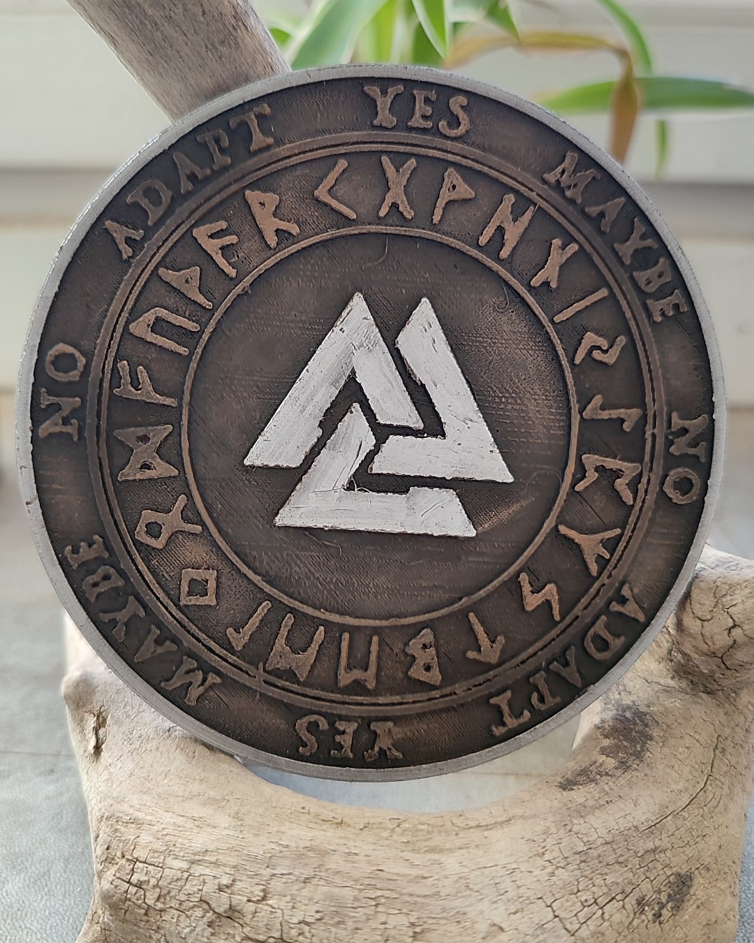 Le cercle extérieur indique : Yes / No / Maybe / Adapt. Un second cercle présente des caractères runiques, permettant un travail plus symbolique ou intuitif selon la pratique.